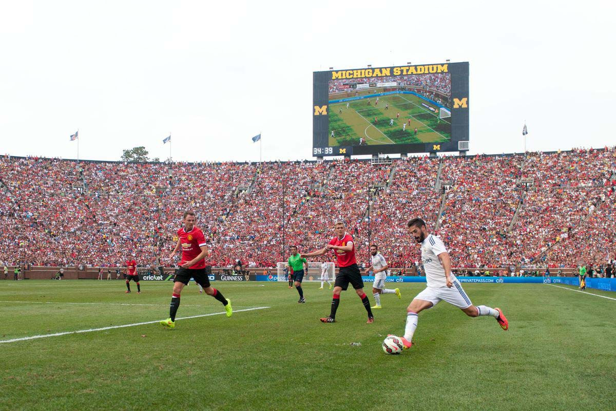 ยกตัวอย่างเช่นเกมระหว่าง แมนฯ ยูไนเต็ด กับ เรอัล มาดริด ในการอุ่นเครื่องที่สหรัฐอเมริกาเมื่อปี 2014 ที่สามารถสร้างสถิติผู้ชมในการแข่งขันฟุตบอล (หรือ ซอคเกอร์ ตามที่ชาวอเมริกันเรียก) สูงถึง 109,138 คน ณ มิชิแกน สเตเดียม สนามของทีมอเมริกันฟุตบอลของมหาวิทยาลัยมิชิแกน ทำลายสถิติเดิม 101,799 คน (เกิดขึ้นในเกมชิงเหรียญทองโอลิมปิกระหว่างฝรั่งเศสกับบราซิลในปี 1984 ที่สนาม โรสโบว์ รัฐแคลิฟอร์เนีย) ลงอย่างง่ายดาย