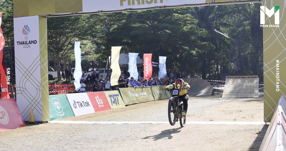 "เบส" เมธาสิทธิ์ บุญเสน่ห์ นักกีฬาทีมชาติไทย ควบสองล้อคู่ใจ กระโดดข้ามเนิน ก่อนเข้าเส้นชัย คว้าเหรียญทองด้วยเวลา 2:37.856 นาที ในการแข่งขันจักรยานเสือภูเขาดาวน์ฮิลล์ ชาย มหกรรมกีฬาซีเกมส์ ครั้งที่ 33 ที่สวนสัตว์เขาเขียว จ.ชลบุรี เมื่อวันที่ 10 ธ.ค. 68 ที่ผ่านมา