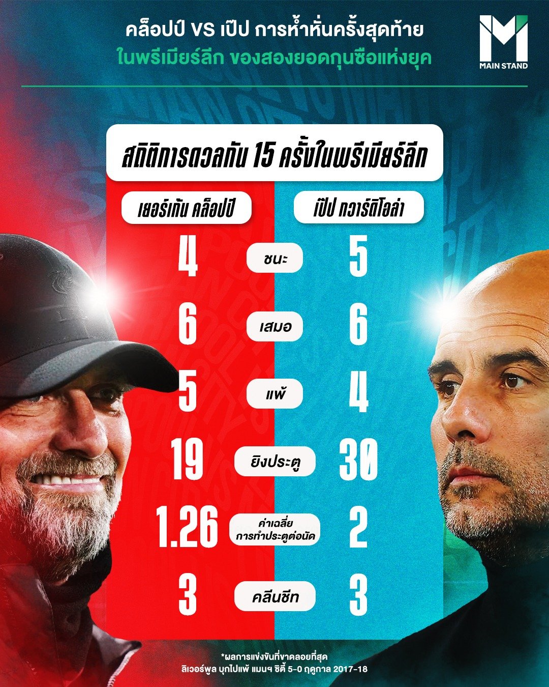 ในขณะเดียวกัน เป๊ป ยังถือครองสถิติในบ้านสุดแกร่ง เพราะ เยอร์เก้น คล็อปป์ ไม่เคยพาทีมบุกไปชนะแมนฯ ซิตี้ ภายใต้การคุมทีมของ เป๊ป ที่ เอติฮัด ได้เลย และจะจบลงด้วยสถิตินี้