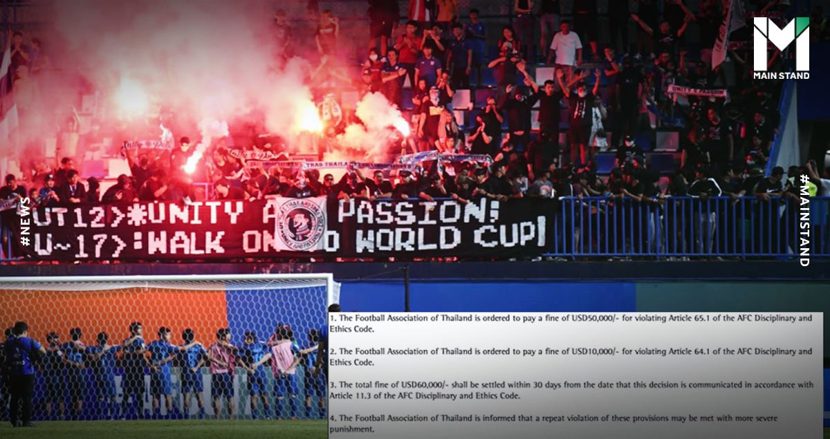 คณะกรรมการวินัยและจริยธรรมของ AFC แจ้งบทลงโทษถึงสมาคมกีฬาฟุตบอลแห่งประเทศไทยฯ จากกรณีที่แฟนบอลกลุ่มหนุ่งจุดพลุแฟลร์ในสนามบีจี ปทุม ศึกยู 17 ชิงแชมป์เอเชีย 2023 รอบสุดท้าย หลังเกมที่ ไทย แพ้ เกาหลีใต้ 1-4 รอบ 8 ทีมสุดท้าย วันที่ 25 มิ.ย.66