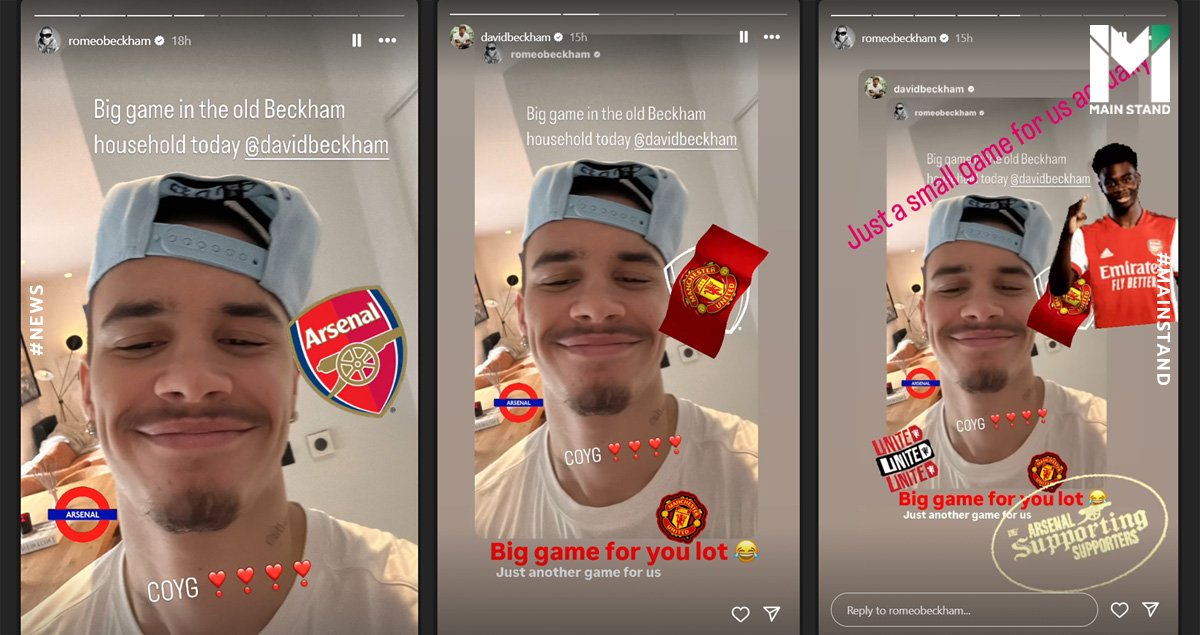 โรเมโอ ลูกชายคนที่ 2 ของ เดวิด เบ็คแฮม ที่เป็นแฟนบอลอาร์เซน่อล โพสต์ลง Instagram Story ก่อนเกมที่อาร์เซน่อลจะพบแมนฯ ยูไนเต็ด โดยบอกว่า ศึกใหญ่ของบ้านเบ็คแฮมประจำวันนี้ พร้อมแท็ก IG คุณพ่อไว้ด้วย