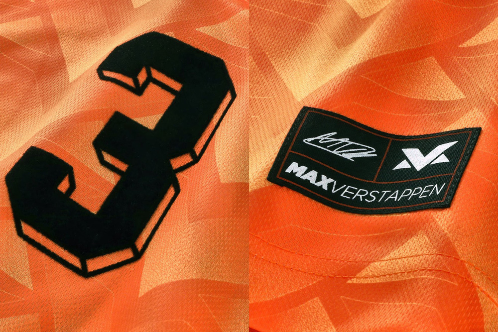 ชื่อ VERSTAPPEN พร้อมหมายเลข 3 เบอร์ประจำตัวของ มักซ์ ปรากฏอยู่ด้านหลังของเสื้อ พื้นหลังเสื้อทั้งหมดมีลวดลายอักษร "MV" แบบซ้ำ ๆ สื่อถึง มักซ์ เวอร์สแตพเพ่น และยังมีลายเซ็นของนักแข่งรายนี้ ติดอยู่ตรงอกเสื้ออีกด้วย