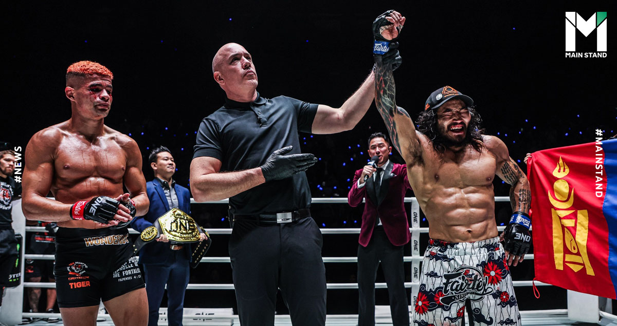 คู่เอก ชิงแชมป์โลก ONE MMA รุ่นแบนตั้มเวต 145 ปอนด์ เอ็งค์ ออร์กิล บาทาร์คู นักสู้ชาวมองโกเลีย ที่หลายคนอาจคุ้นหน้าจากการเป็นตัวตึงของรายการ Physical: Asia พลิกสถานการณ์ กลับมาชนะซับมิชชั่น ฟาบริซิโอ อันดราเด จากบราซิล ยก 4 คว้าแชมป์โลกไปครอง พร้อมได้โบนัส 50,000 ดอลลาร์สหรัฐ จากบอส ชาตรี ศิษย์ยอดธง