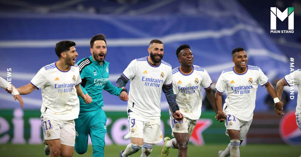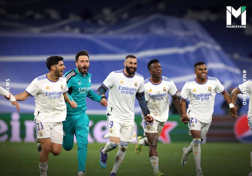 รายของ "ราชันชุดขาว" ผ่านเข้าไปลุ้นถ้วยยุโรป สมัยที่ 14 แบบหวุดหวิดหลังได้ โรดริโก้ พังสองประตูช่วงนาทีสุดท้ายจนประตูรวมเสมอกับ แมนเชสเตอร์ ซิตี้ แล้วเป็น คาริม เบนเซม่า สังหารจุดโทษให้ทีมเฉือนชนะ "เรือใบสีฟ้า" หืดขึ้นคอ 6-5