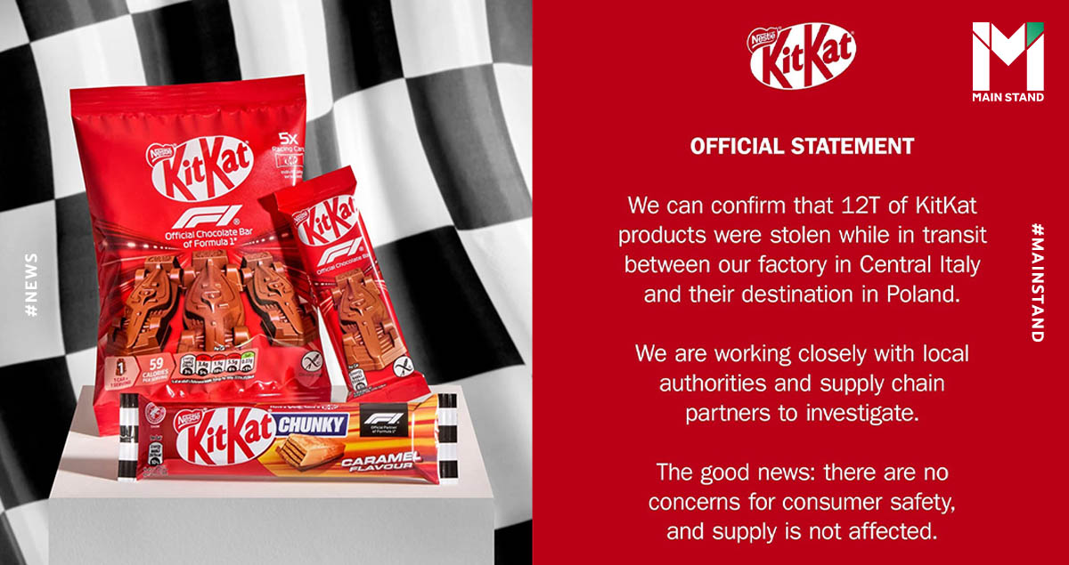 Nestle เครือบริษัทอาหารระดับโลก ที่เป็นบริษัทแม่ของ KitKat แบรนด์ช็อกโกแลตชื่อดัง ออกแถลงการณ์ยอมรับว่า รถขนส่งของพวกเขาที่บรรทุกช็อกโกแลตหนักถึง 12 ตัน ถูกปล้นระหว่างการขนส่งจากโรงงานในประเทศอิตาลี สู่จุดหมายที่ประเทศโปแลนด์ หลังจากที่สื่อหลายสำนักรายงานเรื่องนี้ พร้อมทั้งระบุว่า ช็อกโกแลตที่ถูกขโมย คือผลิตภัณฑ์ใหม่ที่ช็อกโกแลตเป็นทรงรถแข่ง F1