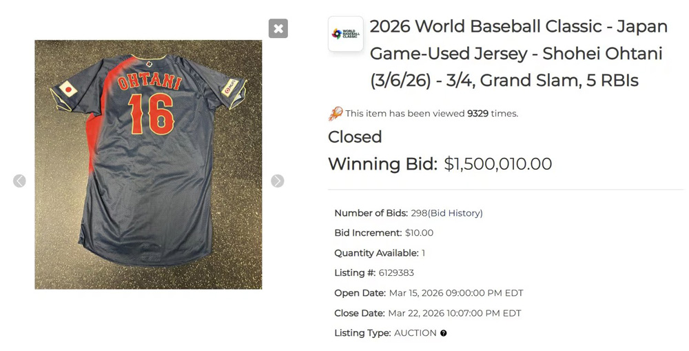 เสื้อแข่งทีมชาติญี่ปุ่นของ โชเฮย์ โอตานิ ซูเปอร์สตาร์แห่งวงการเบสบอลในเกมที่ชนะไต้หวัน 13-0 ในศึก เวิลด์ เบสบอล คลาสสิก ถูกประมูลเป็นสถิติใหม่ของตัวเองในมูลค่าถึง 1.5 ล้านเหรียญสหรัฐ (49.5 ล้านบาท) เมื่อคืนวันอาทิตย์ที่ผ่านมา